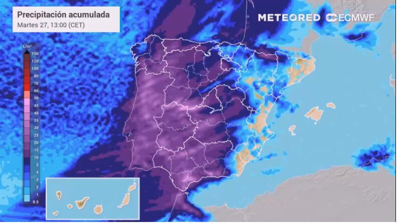 Entre hoy y el sábado la situación será calcada, con el paso de nuevos sistemas frontales que repartirán precipitaciones casi generalizadas, más abundantes e intensas en Galicia y en los principales sistemas montañosos. Como es habitual en este tipo de circulaciones del oeste, los registros menos importantes se concentrarán a orillas del Mediterráneo, donde caerán en muchas zonas menos de 10 l/m². Canarias permanecerá también al margen de este nuevo tren de borrascas.