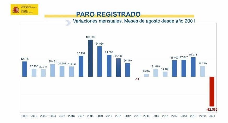 El número de personas desempleadas inscritas en las oficinas del Servicio Público de Empleo Estatal (SEPE) ha descendido en 82.583 respecto al mes de julio. Se trata de la mayor caída del paro registrado en un mes de agosto de toda la serie histórica.