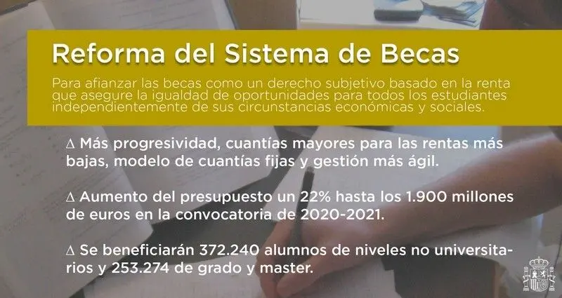 Tal como anunció la ministra de Educación y Formación Profesional, Isabel Celaá, en el Congreso el pasado febrero, el Ministerio de Educación y Formación Profesional y el Ministerio de Universidades han llevado a cabo una importante reforma del Sistema Estatal de Becas y Ayudas al Estudio que revertirá, a lo largo de esta legislatura, las medidas adoptadas en 2012 y afianzará las becas como un derecho subjetivo basado en la renta que asegure la igualdad de oportunidades para todos los estudiantes, independientemente de sus circunstancias económicas y sociales.