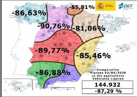 Tal y como se recogen en las intensidades diarias de tráfico, el viernes se produjo un descenso de un 87% del tráfico de vehículos ligeros, aunque hay zonas de la península, en las que el porcentaje es algo menor, tal y como se muestra en el mapa