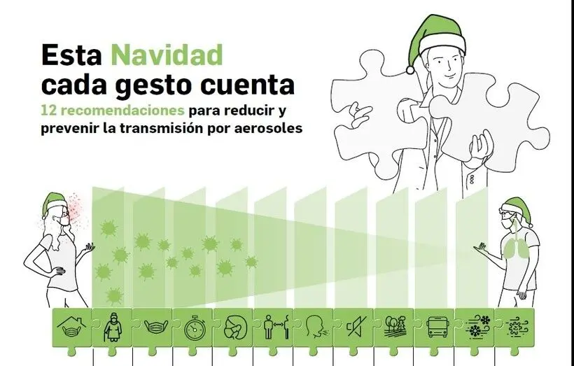 Estos son días de rencuentro y de compartir momentos, de comidas y cenas familiares, pero deben ser días de responsabilidad y sentido común para que las reuniones sean lo más seguras posibles. Por todo ello, el Consejo General de Colegios Farmacéuticos ha elaborado una infografía con consejos para prevenir el contagio por una de las principales vías, los aerosoles. Doce sencillas medidas para tratar de reducir y prevenir la transmisión aérea del SARS-CoV-2 mediante esas pequeñas partículas que expulsamos al hablar o toser, por ejemplo. Todas las medidas son complementarias y tan importantes unas como otras, y deben realizarse de forma conjunta, solo de esa manera reduciremos al mínimo el riesgo de contagio, porque esta Navidad cada gesto cuenta.