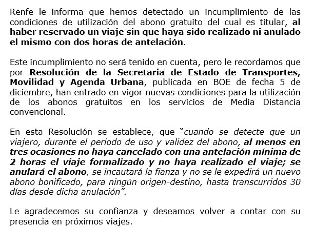 a sancionar. Renfe incautará la fianza de 20 euros y anulará el abono gratuito a los usuarios. Aun así, se establece un plazo transitorio de 7 días en los que se informará al viajero del incumplimiento sin que este