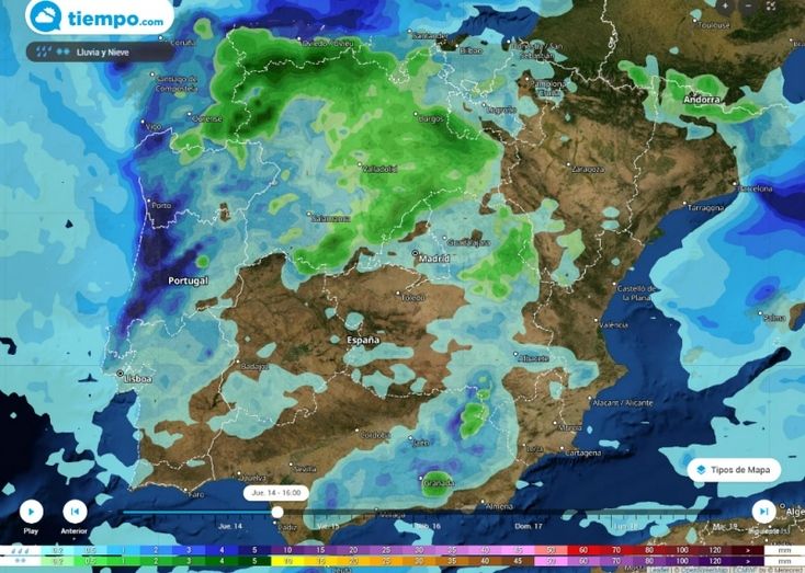 El domingo entrará otro frente por el norte, pudiendo provocar desbordamientos de algunos ríos debido a la persistencia de las lluvias en esta zona. La nieve continuará llegando a los sistemas montañosos, con vientos de oeste al noreste.