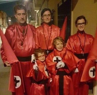 Era todo rojo, tanto la túnica como la caperuza. Luego, estaba la cruz negra con su fondo blanco a la altura de mi pecho y no podían faltar los guantes blancos y el cordón negro. Todos íbamos iguales, menos él. Él iba de traje y chaqueta con un colgante de la cruz de nuestro Cristo de la Expiación.
