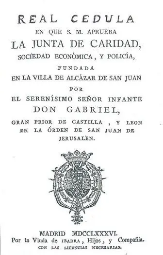 No sabemos la fecha exacta del cierre del deficitario tercer hospital, el mencionado como “hospital de pasajeros” pero, aún así, el sostenimiento económico de los otros dos hospitales debía de resultar ya muy gravoso para la Orden, lo que unido a la iniciada decadencia económica y al estado deplorable en el que se encontraba la villa, hizo que Carlos III, a petición de su “muy caro y amado hijo” el Infante Don Gabriel, Gran Prior de la Orden, promulgara la “Real Cédula en que S. M. aprueba La Junta de Caridad, Sociedad Económica, y Policía, fundada en la Villa de Alcázar de San Juan por el serenísimo Señor Infante Don Gabriel, Gran Prior de Castilla y León en la Orden de San Juan de Jerusalén”, dictada en Madrid el año 1786.