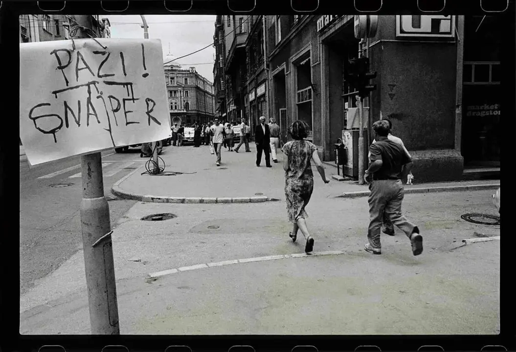 Cartel de "¡Cuidado, francotiradores!" en una de las calles de Sarajevo durante el asedio de la ciudad bosnia.