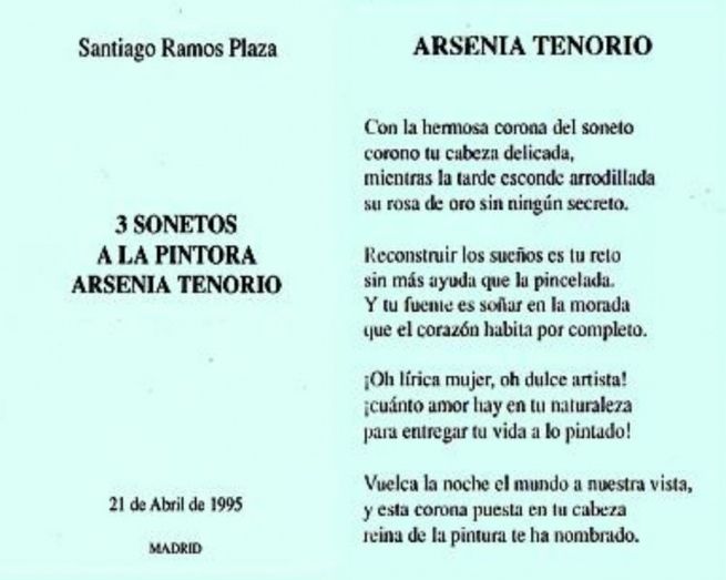 Este mismo año, asistí a su exposición de óleos sobre El Quijote, admirando la interpretación que había hecho de los pasajes cervantinos con figuras, ideal para mi comentario. Arsenia, de pronto, con la gala de su espontaneidad generosa, descolgó un cuadro y me lo regaló ante la concurrencia. Nunca, que yo sepa, aquí estaba la muestra, nuestra pintora mezcló lienzos de temas diversos; todo lo que exponía recogía un solo asunto desarrollado en el conjunto de la obra presentada en la sala. Esta modélica forma de trabajar coincidía con la mía desde el comienzo de mi poesía, que era lo que yo editaba por entonces.