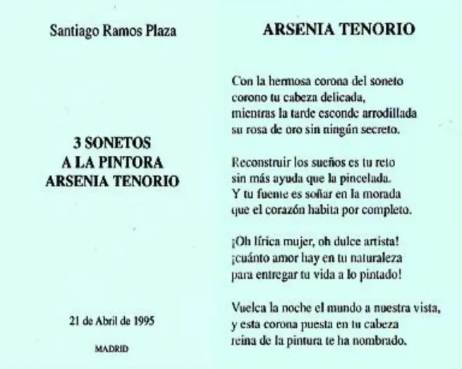 Con la noticia de su fallecimiento en los brazos, me senté. Inmediatamente volví a verme a su lado, en aquellos años noventa en que la traté con asiduidad amistosa, también a Javier, su marido. Nos había presentado José Mari Palmero, que nos llevó en su auto a la casa en que vivían en el pueblo de Quero. Y frecuentamos en visita de invitados su casa y el taller paredaño en que pintaba Arsenia con su soledad atada a la cintura como quieren los artistas.