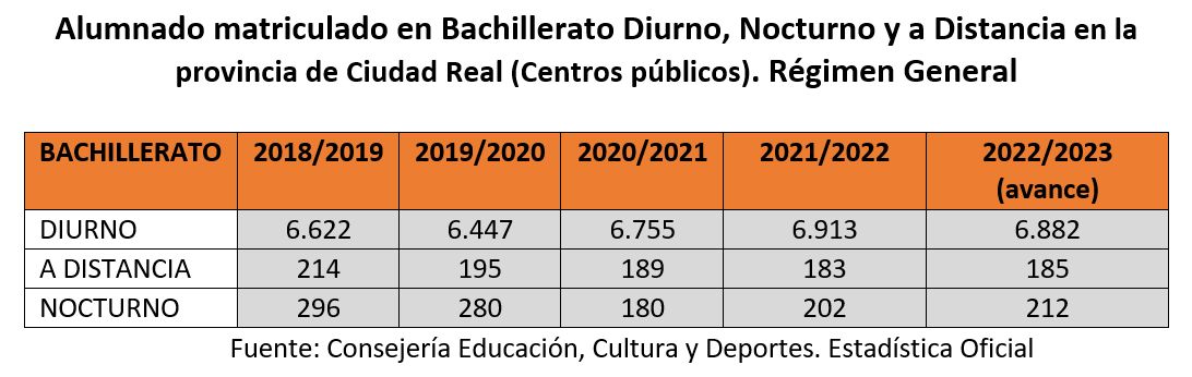 El número de estudiantes matriculados en bachillerato nocturno, en el último periodo contemplado en las estadísticas que disponemos, se ha reducido considerablemente. En la provincia de Ciudad Real, el descenso es menor que en el conjunto de la Comunidad donde se imparten las clases nocturnas.