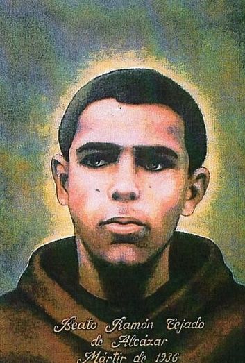 Fr. Ramón Tejado nació en Alcázar el 20.5.1915, de padres jornaleros del campo. Sintió desde pequeño inclinación y amor por las cosas religiosas, aún en medio de un ambiente hostil. Fue devoto de la Virgen María y de la Eucaristía, quedándose a veces en ayunas para comulgar. Alegre y juguetón, se entristecía cuando oía hablar mal. Era monaguillo en San Francisco y fue estimado por los sacerdotes. Superando oposiciones, ingresó en el Seminario franciscano de Alcázar el año 1926 y continuó estudios en La Puebla de Montalbán, Pastrana y Consuegra, hasta acabar segundo curso de teología. No pudo hacer la profesión religiosa solemne por hallarse sujeto al servicio militar. Fue muy piadoso, humilde y caritativo, fraile ejemplar. Se opuso a que un tío quisiera llevárselo a casa ante la persecución religiosa, prefiriendo morir con los frailes, sus hermanos en religión, que lo estimaban por su optimismo, servicialidad y amabilidad. ¡Que interceda por nosotros ante el Señor!