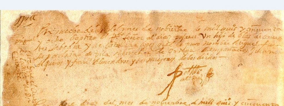 “En nuebe días del mes de Noviembre de mil quinientos cincuenta y ocho, bautizo el Rdo. señor Alonso Díaz Pajares un hijo de Blas de Cervantes Sabedra y de Catalina López que le puso nombre Miguel, fue su padrino de pila Melchor de Ortega acompañados Juan de Quirós y Francisco Almendros y sus mujeres de los dichos”.