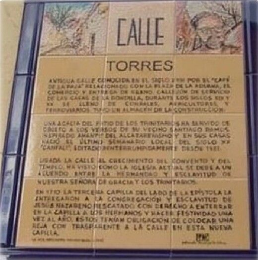 La calle Torres, denominada en la actualidad, era conocida hace más de doscientos años por “El café de la paja”, por su cercanía con la Plaza de la Aduana - donde precisamente nació José Corredor Matheos en una casa que hacía esquina-. Por ahí pasaba la cañada Real Soriana y posiblemente deba su nombre, según nos comentan, a “una puerta de entrada con algún edificio elevado cercano al Arenal, que en aquel tiempo era una especie de descansadero de ganado de la cañada. Parece que, por entonces, había un contadero de aduana y alguna torre en un edificio de dos pisos donde se controlaba el paso del ganado”.