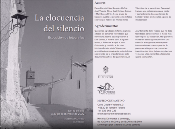 “La elocuencia del silencio” es el título sugerente de una colección de fotos que exhibe el Museo Cervantino del Toboso en estos días. La colección no es cualquier cosa, se trata de un reportaje fotográfico de este pueblo a finales de los años setenta del pasado siglo, justo antes, como se dice en la cuidada presentación, “de la gran transformación de los años ochenta y siguientes”. Un documento irrepetible que proclama entre otras cosas el valor sin precio de una arquitectura que lo fue sin arquitectos, el valor de aquellos elementos constructivos autóctonos y del orden apacible resultante. Un patrimonio. El título de la colección bien podría referirse al poder que tiene la imagen; el poder del que se dice que “vale más que mil palabras”, o al mutismo que se percibe en el objeto inerte de lo fotografiado. Incluso podría referirse, ¿por qué no?, a la evocación literaria del “sosegado silencio”, el que descubrió Cervantes y que por mor de la exposición se pone a nuestro alcance. El silencio.