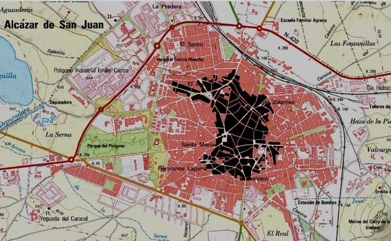 La villa de Alcázar de San Juan que refleja este primer mapa la he dibujado en negro sobre el mapa actual del Sistema de Información Geográfica de Parcelas Agrícolas (SigPac). Así era el lugar de don Quijote en 1600: