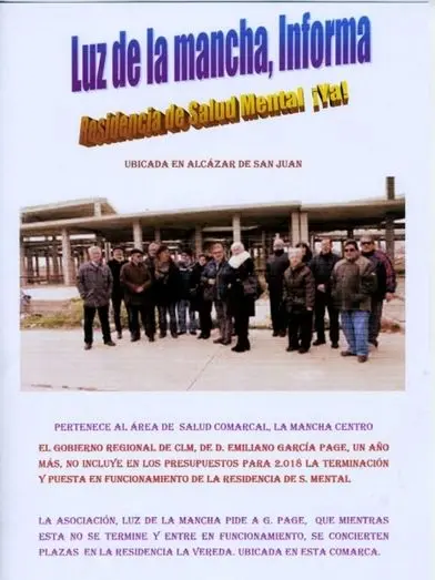 Dentro de sus actividades, la asociación luz de la Mancha tiene como uno de sus principales objetivos que el gobierno regional termine y ponga en marcha, de una vez por todas, la Residencia de Salud Mental, ubicada en Alcázar, cuyas obras lleva paralizadas ya más de siete años.