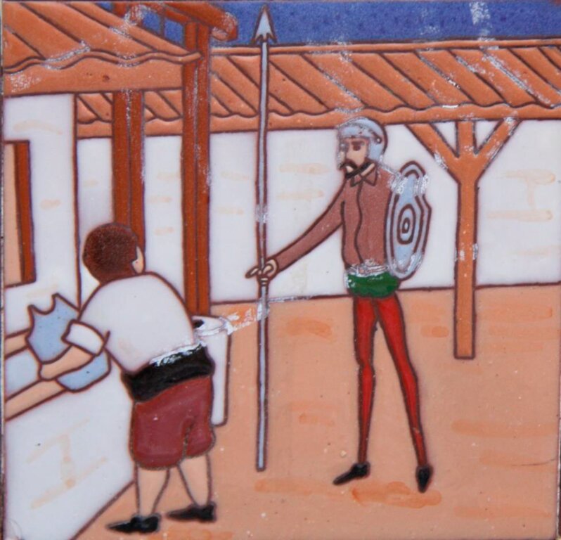 N. La ilustración se ha recogido del estudio: AZULEJOS DEL QUIJOTE EN EL PARQUE CERVANTES ALCAZAR DE SAN JUAN, 2016. CUARTO CENTENARIO DE LA MUERTE DE MIGUEL DE CERVANTES SAAVEDRA. Autor: Constantino López Sánchez-Tinajero, Sociedad Cervantina de Alcázar de San Juan