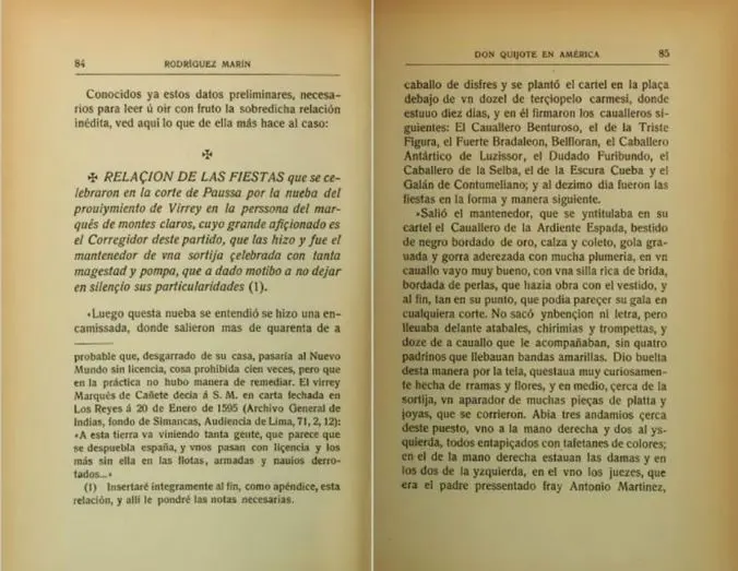 Y a su vez, este magnífico y detallado trabajo donde no solo está el facsímil del documento original sino la edición transcrita al castellano entendible, me llevó al origen, a Francisco Rodríguez Marín, cervantista que fue el primero en dar noticia de la celebración de una representación quijotesca en la ciudad peruana, siendo un curioso documento titulado “RELAÇION DE LAS FIESTAS que se celebraron en la corte de Paussa por la nueba del prouiymiento de Virrey en la perssona del marqués de montes claros, cuyo grande afiçionado es el Corregidor deste partido, que las hizo y fue el mantenedor de vna sortija çelebrada con tanta magestad y pompa, que a dado motibo a no dejar en silençio sus particularidades”, publicado como Apéndice en su libro “El Quijote y don Quijote en América” (1911, Librería de los Sucesores de Hernando), donde se recogen los pormenores del suceso y son dignos de leerse en toda su extensión, por lo profuso y detallado de su descripción.