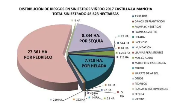 Dichas indemnizaciones corresponden a 46.623 hectáreas siniestradas, un 22% del total de superficie de viñedo asegurado en Castilla-La Mancha que se ha visto perjudicado este año por todos y cada uno de los riesgos cubiertos por nuestro seguro integral de viñedo: pedrisco, sequía, helada, fauna silvestre y cinegética, asurado, inundación, viento, inundación, mal cuajado, marchitez, lluvias persistentes, mildiu, otras plagas o enfermedades, daños en la madera, etc., e incluso algunas hectáreas por incendio.