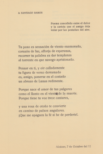 Soneto dedicado a Santiago que incluí en la selección de poemas publicados en Antología 1ª (1973). Libro costeado por Santiago, Andrés Morillo y yo, impreso por Palmero, que contó con la colaboración de Severino Barrios, profesor de francés del Instituto de Alcázar, y los pintores, José Luis Samper y Pepe Herreros. Una singularidad del libro es que cada uno dedicamos un poema a Miguel Hernández, ilustrado por Herreros, cuando todavía no se había propagado su obra y su nombre como sucedió años después.