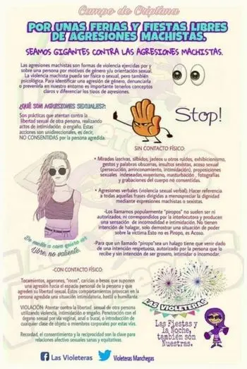 Próximas a la celebración de la Feria y fiestas de nuestro municipio con su tradicional pólvora de inauguración y la conocida “Fiesta Ye yé”, del próximo 23 de agosto, desde la Asociación Feminista “Las Violeteras Criptana” presentamos la campaña “Seamos gigantas contra agresiones machistas».
