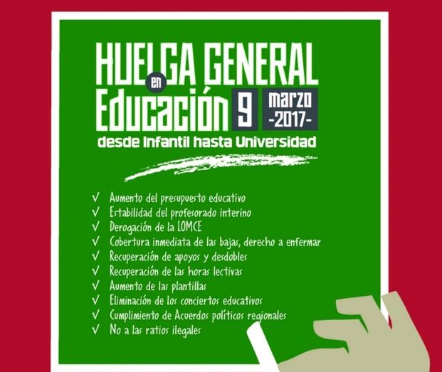 El 9 de marzo se convoca una huelga general de educación con el propósito de exigir al Gobierno la reversión de los recortes en educación, el incremento presupuestario destinado a la educación pública, la derogación de la LOMCE, un sistema de becas que garantice la igualdad de oportunidades, la eliminación de las "contrarreformas" universitarias y de las prácticas no remuneradas en Formación Profesional, y la bajada de las tasas universitarias.