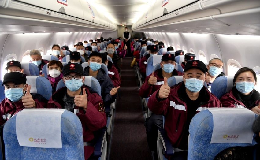 CHENGDU, 21 febrero, 2020 (Xinhua) -- Empleados médicos a bordo de un avión posan previo a partir hacia la provincia de Hubei, en el Aeropuerto Internacional Shuangliu de Chengdu, en Chengdu, en la provincia de Sichuan, en el centro de China, el 21 de febrero de 2020. Los cuatro aviones ARJ21 fabricados en China y un avión Airbus con 231 empleados de la salud y suministros médicos, volaron a Hubei el viernes para ayudar en la lucha contra el nuevo coronavirus. (Xinhua/Liu Kun)