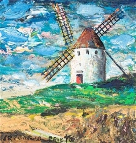Al ya mencionado pintor Gregorio Prieto le atraía fuertemente el mundo cervantino, seduciéndole el entorno manchego. Walter Starkie bien lo hace notar cuando afirma que para comprender su arte se ha de ir, inevitablemente, a La Mancha. La bibliografía de Prieto (este pintor universal también era escritor) sobre el tema de Don Quijote y los molinos de La Mancha es muy fecunda. En 1953 obtuvo el Molino de Oro en la Exposición de Artes Plásticas de Valdepeñas precisamente con el cuadro 'El sueño de los molinos". Todas estas obras de temas manchegos, como señala José Corredor-Matheos en su completa monografía publicada por la Fundación Gregorio Prieto, “resultan muy anticonvencionales y son muestra de una gran libertad”. Prieto reflejó, en una total amplitud cromática, el conjunto de los molinos de Consuegra, y también los de Campo de Criptana. Son las dos panorámicas más vistosas. Yo prefiero la de Consuegra, cosa que no le puedo decir a mi nuera, devota criptanense.