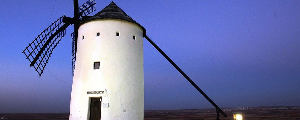 El molino manchego alcanza un gran protagonismo por la más famosa aventura de Don Quijote, esa lucha del caballero contra los que toma por desaforados gigantes. Vladimir Nabokov escribió un amplio tratado resaltando la desorbitada viveza que ostentan “los molinos de viento en la descripción de Cervantes”, suplicándonos que no nos riamos más de Don Quijote, pues “su blasón es la piedad, su estandarte la belleza. Él está a favor de todo lo que es tierno, perdido, puro, desinteresado y galante.” El escritor holandés Cees Nooteboom, quien acude a las gratas palabras de Nabokov, afirma con rotundidad en su peculiar libro de viajes por España ‘El desvío a Santiago’: “Lo que ves acercándote a Consuegra es el momento de inspiración del autor”. Centrando ese momento pendencioso en Consuegra y no en Campo de Criptana, lugar más aceptado como escenario de esa lucha con aquellos gigantes “de los brazos largos, que los suelen tener algunos de casi dos leguas”, al decir del exagerado Don Quijote. Nooteboom sube al cerro Calderico y exclama: “No, allí arriba no estás en el mundo normal, sino en el reino de la imaginación.”