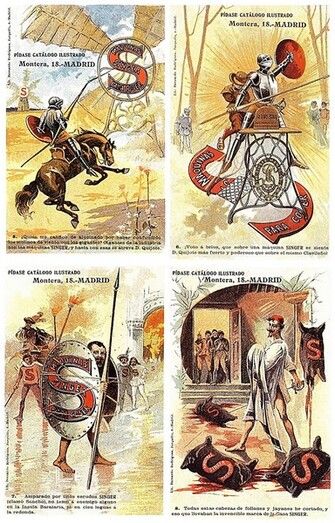 Pasemos ahora a lo que interesará a los quijotistas. En 1905, III Centenario del Quijote, aparecieron en España las diez exquisitas (y descaradamente publicitarias) tarjetas postales de SINGER, estampadas por el litógrafo madrileño Bernardo Rodríguez. Las ilustraciones no llevan firma, pero en algunas de ellas salta a la vista que su autor se inspiró en las ya muy conocidas del barcelonés Jaume Pahissa i Laporta (1846-1928), divulgadas en los cromos que acompañaban los productos de Chocolates Amatller. Fue mi amigo y consocio Constantino López Sánchez-Tinajero quien me dio a conocer su existencia, y las que obtuve de la página web Biblioteca Histórica Municipal de Madrid sólo han precisado un ligerísimo retoque para darles algo más de viveza. En las postales se muestran los modelos fijo y portátil (no tanto, pues pesaba más de 10 kg) y el comentario al pie de cada postal no tiene desperdicio (mi preferida es la núm. 4). Ni siquiera se desaprovechaba el dorso, pues en él se indicaba la cuota semanal para la compra de una de sus máquinas. Todo indica que sólo se distribuyeron en Madrid; del resto se encargaría el servicio de Correos: idea genial que el avispado fundador habría aplaudido.