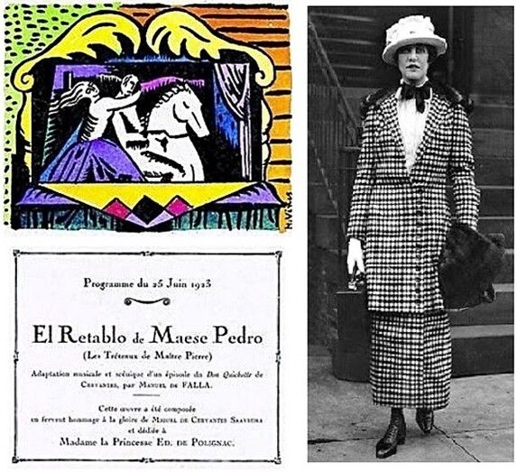 Olvidábaseme de decir que el bueno de Mr. Singer tenía una pésima opinión del intelecto femenino (se llegó a decir que la gran ventaja que vio en su invento era que prometía mantener calladas un rato a las esposas), pero vivió rendido con armas y bagajes a sus encantos, al punto que acumuló 24 hijos con cinco mujeres distintas. Una de sus hijas, Winaretta (1865-1943), mecenas y musa parisina, fue quien encargó en 1918 a Manuel de Falla su obra El retablo de Maese Pedro, representada cinco años después en el palacete de la Princesse de Polignac, es decir, Winaretta Singer, que, aunque lesbiana, estuvo casada con Edmond de Polignac (1834-1901), un noble venido a menos y mucho mayor que ella: perfecto matrimonio de conveniencia, pues Edmond era homosexual. Eso fue en segunda nupcias: su primer matrimonio fracasó porque ella se negó a consumarlo (entre la haute société parisina se rumoreó que, la misma noche de bodas, Winaretta amenazó de muerte a su flamante esposo si osaba ponerle las manos encima).