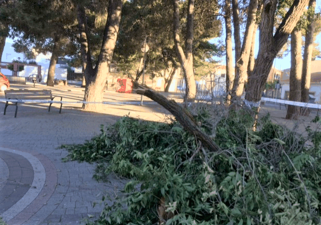 10 de julio a las 01:30 horas, los vecinos de la Plaza se despiertan con un ruido inusual a esas horas, ha quebrado una de las ramas con más peso del pino que preside el paso de cebra de la Plaza.