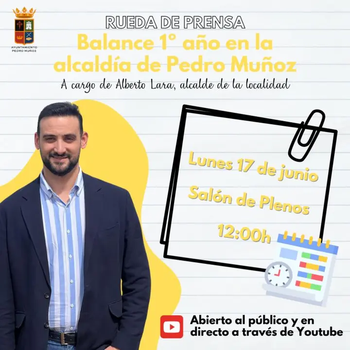 Alberto Lara, alcalde de Pedro Muñoz, llevará a cabo el lunes un acto público, previsto a las 12:00h en el Salón de Plenos del Ayuntamiento para hacer balance e informar de la gestión llevada a cabo durante su primer año de gobierno.