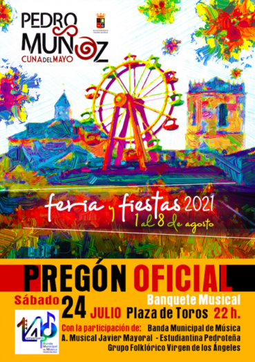 El alcalde de Pedro Muñoz, Carlos Ortiz, y la concejala de Festejos, Mari Sol Izquierdo, han presentado esta misma semana el cartel de la Feria y Fiestas de este año 2021. Una colorida imagen que indica la proximidad de unas fiestas que serán diferentes, atendiendo a los protocolos establecidos por la autoridad sanitaria para evitar la expansión del virus, pero con una intensa programación pensada para todos los gustos y para todas las edades, sobre todo para los más pequeños, que viven estos días con tanta ilusión.