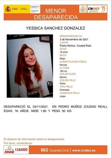 Policía Local y Guardia Civil continúan buscando a la menor desparecida el día 3 de noviembre en la localidad de Pedro Muñoz, y tras la difusión de carteles a través de las redes piden ayuda ciudadana. Se trata de la joven Yessica Sánchez González, de 16 años de edad, mide 1,60 cm y pesa 50 kilos.