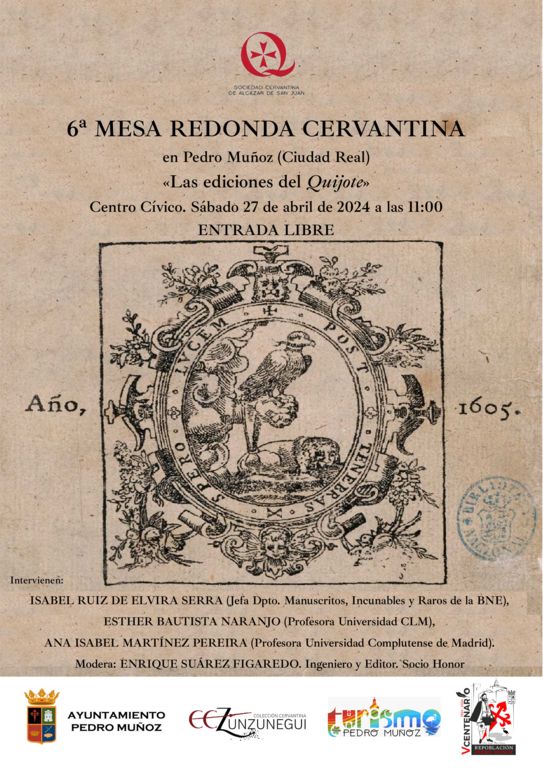 El sábado 27 de abril se celebrará la 6ª Mesa Redonda Cervantina en Pedro Muñoz (Ciudad Real) localidad manchega que alberga la Colección Cervantina Zunzunegui con casi 850 piezas relacionadas con Cervantes y el Quijote