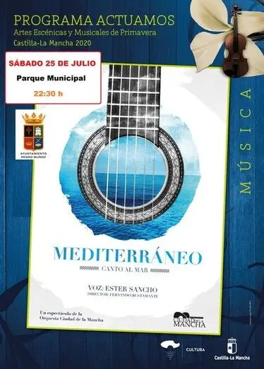 El espectáculo "Mediterráneo", dentro del programa de Artes Escénicas y Muicales de Primavera de la Junta de Junta de Comunidades, llegará esta noche a Pedro Muñoz de la mano de la Orquesta Ciudad de La Mancha, que se transforma para esta ocasión en una gran orquesta, fusionándose con instrumentos como el acordeón, el piano, vientos o percusión, para crear una gama de colores idóneos para la mejor música. Será a las 22:30 horas en el Parque Municipal.