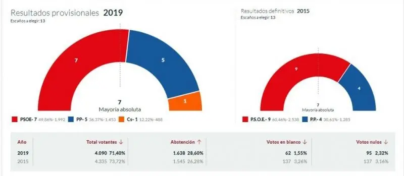 Los dos concejales que ha perdido el PSOE han ido a parar uno al PP y otro a Ciudadanos, que irrumpe en el Ayuntamiento con un concejal, Santiago Delgado Peinado, gracias a los 488 votos obtenidos. Por su parte, el PP, liderado por Alberto Lara, obtiene un concejal más que en las pasadas elecciones, cinco en total, con 1.453 votos y una representación del 36,37%, El PP gana en votos ya que en la pasada legislatura obtuvo 1.285.