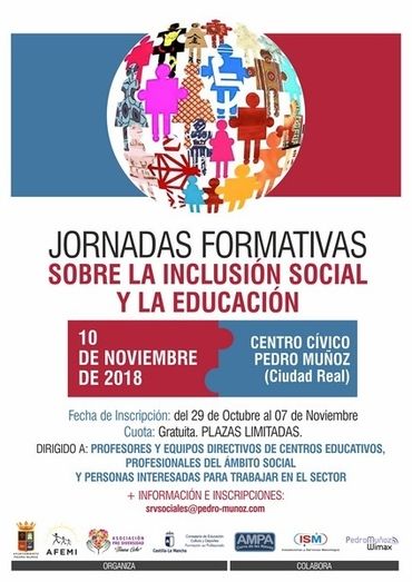 El próximo 10 de noviembre el Ayuntamiento de Pedro Muñoz junto a la Asociación Prodiversidad Tesa Cobo, Afemi y la Junta de Comunidades de Castilla la Mancha organiza las I Jornadas Formativas sobre la Inclusión social y la Educación que se celebrarán en el Centro Cívico.