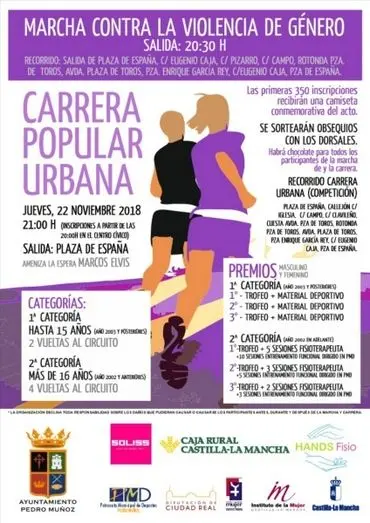 La Carrera contra la Violencia de Género organizada por el Ayuntamiento de Pedro Muñoz permitirá a los pedroteños y pedroteñas mostrar de forma unánime su repulsa por los asesinatos machistas y su solidaridad con las víctimas supervivientes, una carrera que se desarrollará el jueves 22 de noviembre de 2018. Como viene siendo habitual las personas que participen tanto la marcha como la carrera tomarán la salida en la Plaza de España.