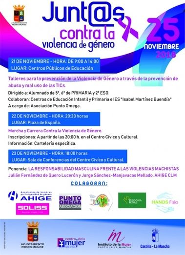 El día 22 de noviembre tendrá lugar la Marcha y Carrera Contra la Violencia de Género, organizada junto al Patronato Municipal de Deportes de Pedro Muñoz; en la que esperamos que todo el pueblo de Pedro Muñoz salga a la calle para lanzar un grito unánime por las mujeres, las niñas y los niños asesinados por violencia de género; para que ninguna mujer más tenga que sufrir más esta forma de violencia gratuita.