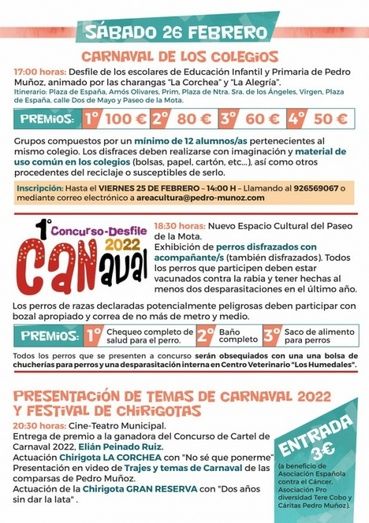 El sábado 26 de febrero comenzarán los actos con el Carnaval de los colegios, cuyo desfile partirá a las 17:00 horas de la Plaza de España. Después, a las 18:30 horas, tendrá lugar el novedoso CANaval, un desfile-concurso de disfraces para mascotas de raza canina, que tendrá lugar en el Nuevo Espacio Cultural.