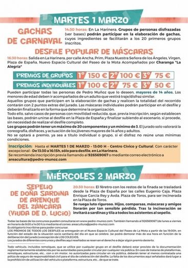 La inscripción en todos los desfiles y concurso se recomienda que se haga con carácter previo y por vía telefónica, llamando al 926 569 067, en horario de mañana, de lunes a viernes. Puede utilizarse como medio contacto también el correo electrónico: areacultura@pedro-munoz.com.