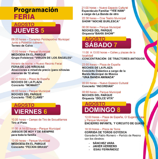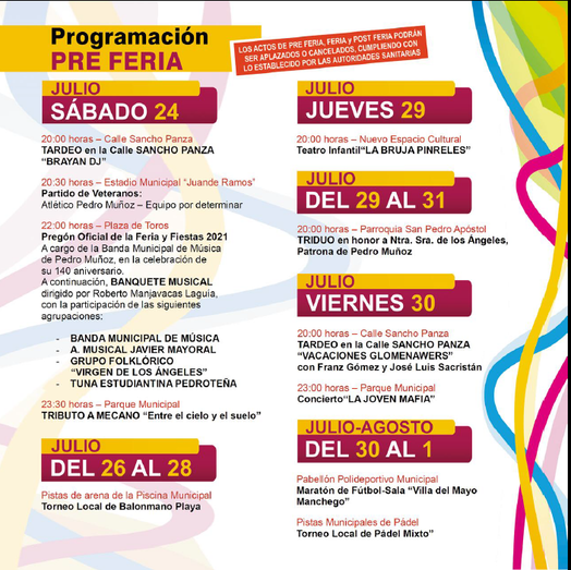 Aunque la Feria propiamente dicha se desarrollará oficialmente del 1 al 8 de agosto, las actividades del programa ya han comenzado, con distintos eventos festivos, culturales, sociales, deportivos y religiosos para dar forma a las primeras fiestas o feria 2021 de la comarca (fuera de la cual, ya se han celebrado las de Manzanares).