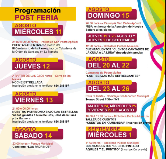 El día 2 de agosto, llegarán los actos en honor a la Patrona de Pedro Muñoz, Nuestra Señora de los Ángeles, con la salida de la imagen al Pretil de la Parroquia, donde la Banda de Música Municipal ofrecerá un concierto.