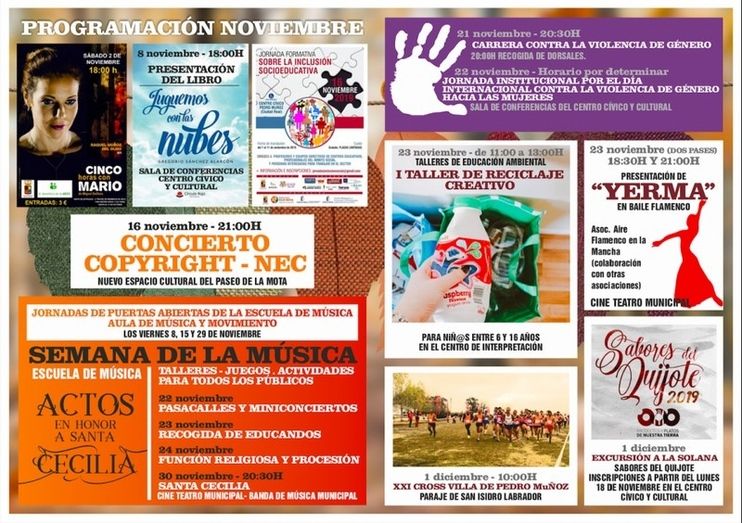 Siguiendo con la música, el 16 de noviembre habrá un concierto a las 21:00 horas en el Nuevo Espacio Cultural de un grupo llamado Copyright. Y el sábado 23, a las 21:00 en el Cine-Teatro Municipal, tendrá lugar la presentación de “Yerma” en Baile Flamenco, a cargo de la Asociación “Aire Flamenco en La Mancha” y otros colectivos.