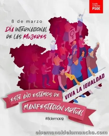 Entre las acciones programadas, se encuentra una "manifestación virtual" a la que animan a sumarse compartiendo la ilustración diseñada por el PSOE de Castilla-La Mancha bajo el título "Viva la igualdad. Este año estamos de manifestación virtual".