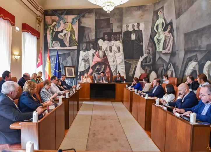 Se ha procedido, asimismo, a la aprobación de una modificación de créditos que, además de otras acciones, el destino de fondos de la Diputación a la rehabilitación y recuperación del Salón de Recepciones del Palacio Provincial, la estancia que sufrió el desprendimiento de parte del techo en el que fue acoplado el lienzo en el que Andrade representó a don Quijote y Clavileño. En la pasada Semana Santa resultaron afectados, asimismo, los flancos en los que se representan los escudos de los partidos judiciales que había entonces en la provincia.