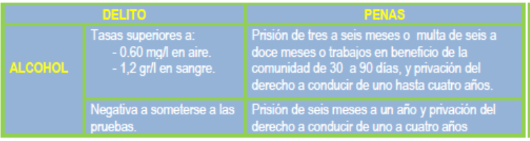 Por su parte, el capítulo IV del Título XVII del Código Penal tipifica los delitos contra la seguridad del tráfico y establece las siguientes penas para conducir con exceso de alcohol o bajo la influencia de drogas.
