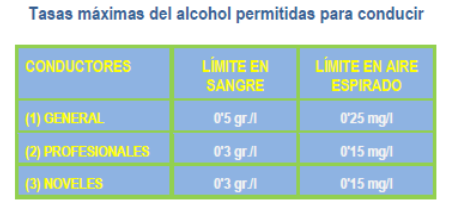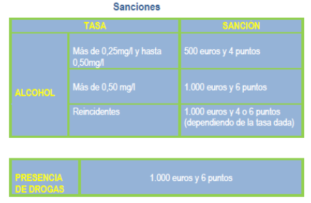 La Ley de Seguridad vial fija las tasas máximas de alcohol permitidas para los conductores, así como la prohibición de conducir con presencia de drogas en el organismo. En este caso se está ante una infracción administrativa.