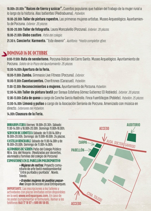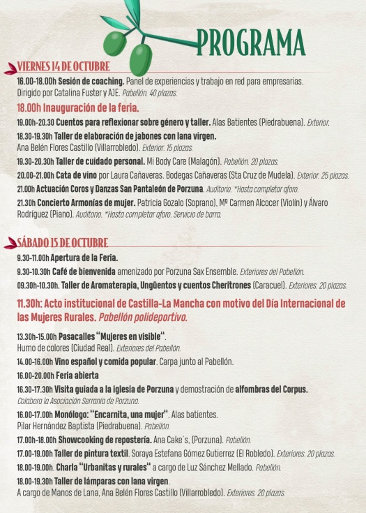 Sesiones de coaching para empresarias, talleres, charlas, catas de vino y queso, comida popular, actuaciones en directo, pasacalles, visitas guiadas por el municipio, demostraciones artesanales, monólogos, showcooking, limoná y puñao … Todo un programa para el negocio y el entretenimiento, al que se une un servicio de ludoteca, para favorecer la asistencia de padres y madres; un castillo hinchable, alfombras de serrín y las exposiciones “Mujeres de rostros” y “Grandes mujeres de pueblos pequeños” en el pabellón polideportivo.